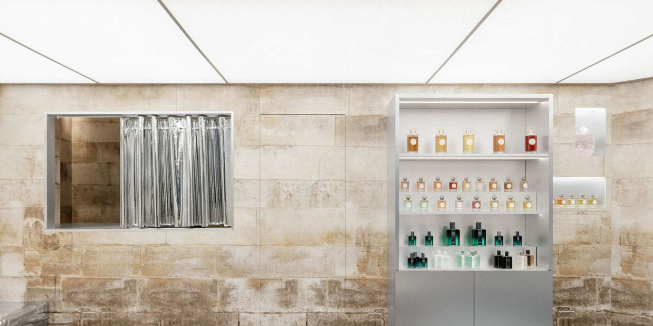 Sur les étagères, les flacons de parfums originaux côtoient quelques fragments d’histoire.
